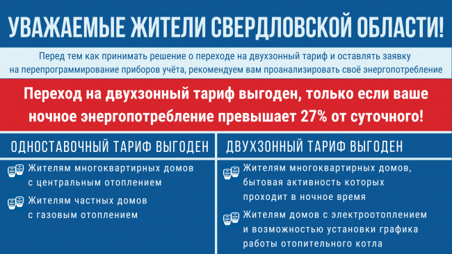 С 1 января 2023 года в Свердловской области отменено применение тарифа для ночной зоны круглосуточно в выходные и праздничные дни. Распределение по зонам суток определено: «день»: с 07:00 до 23:00; зона суток «ночь»: с 23:00 до 07:00.
