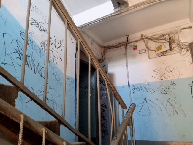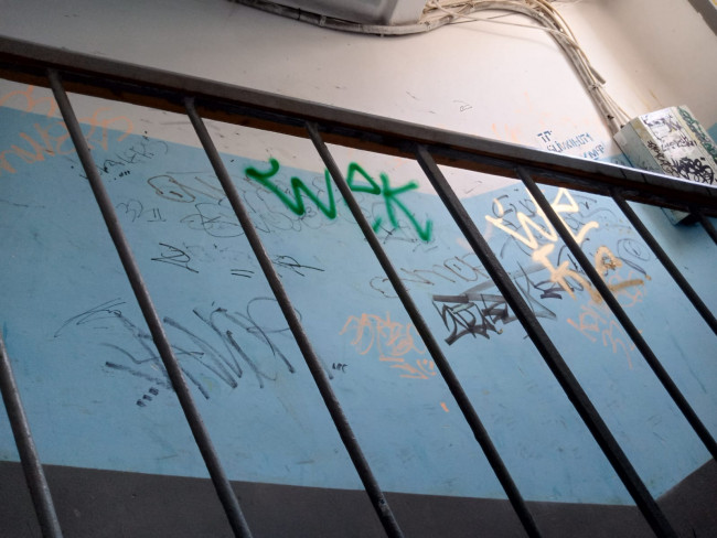 Дом пятиэтажный. Уже при входе в подъезд создается ощущение, что попадаешь в логово граффитчиков. Стены, перила, двери, батареи - везде непонятные надписи. На поверхностях буквально места свободного нет. И такая «картинная галерея» после проведенного ремонта подъездов «открывается» здесь не первый раз. Подрядчики КУДЕЗ ее ликвидируют, но художники вновь и вновь берут в руки баллончики с краской.