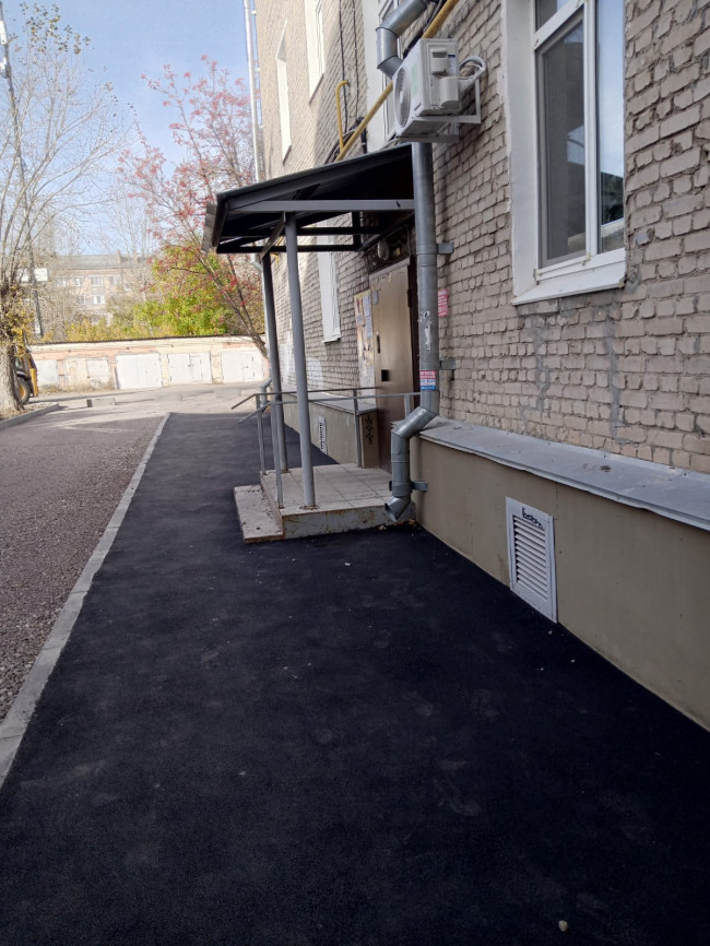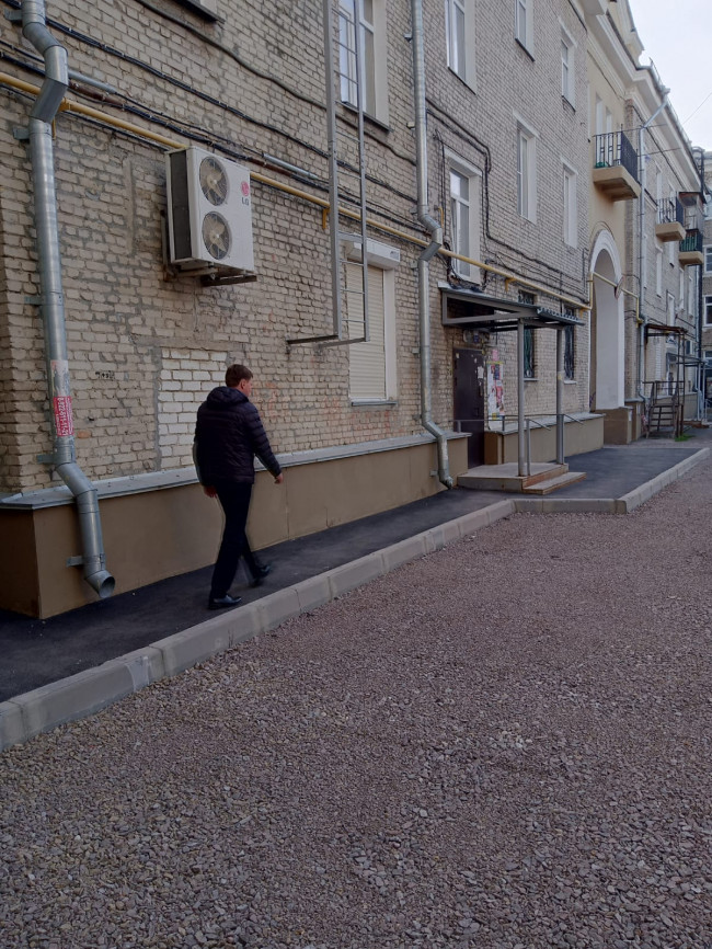 Работы в самом разгаре. Старый асфальт уже снят. Тротуар, идущий вдоль всего дома, заасфальтирован и одет в новые бордюры. Дорога и зона для машин отсыпана в щебне. Со дня на день на эти объекты положат свежий асфальт.