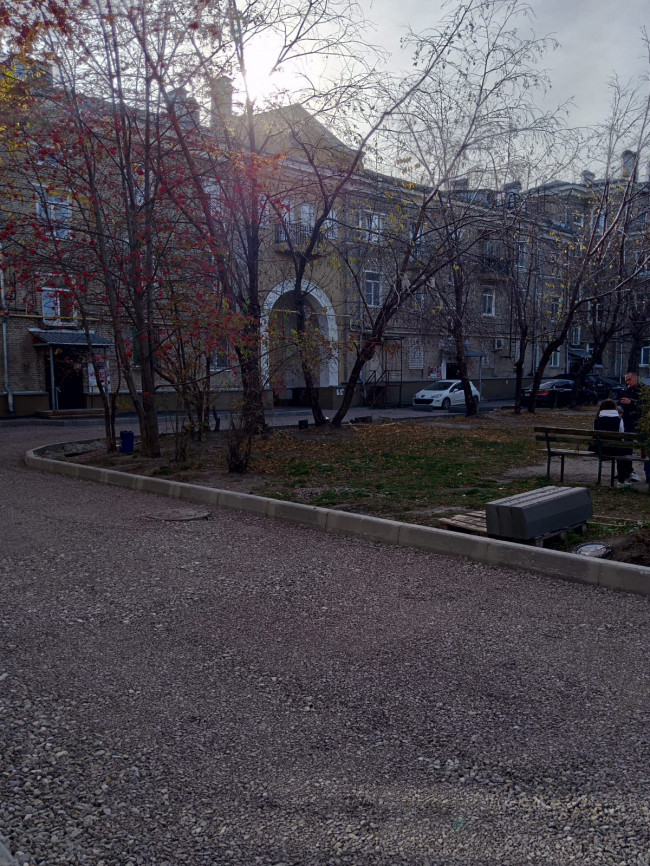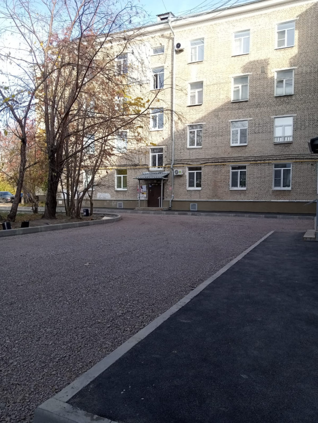 Перечень работ традиционный: ремонт тротуара, внутриквартальной дороги и выделение мест для парковки машин. Дом хоть и не слишком большой — трехподъездная четырехэтажка, личные авто есть у многих. Проблема с парковкой стоит остро. Для организации большой парковки места здесь не слишком много. Но то, которое есть, подрядчик КУДЕЗ постарался зонировать максимально практично. Зеленый фонд, кстати, сохранили.