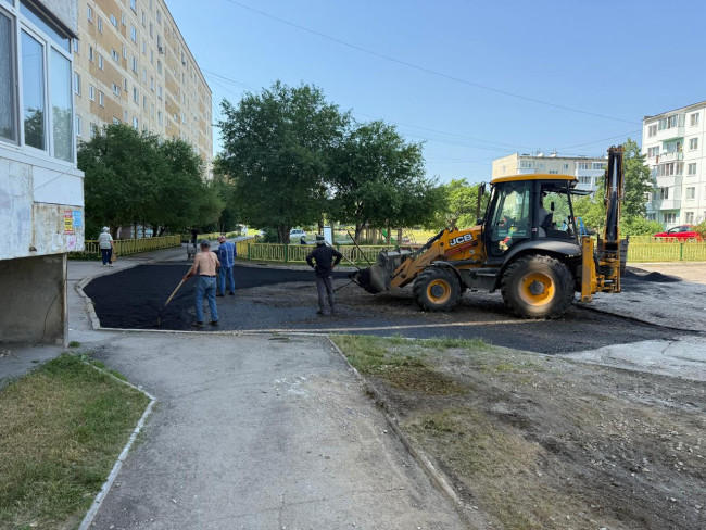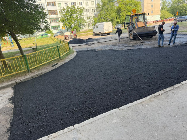Речь идет о дворовой территории Лермонтова, 99. Здесь подрядчик по заданию КУДЕЗ обновляет въезд во двор, парковку и дорогу. Трудятся специалисты с раннего утра.
