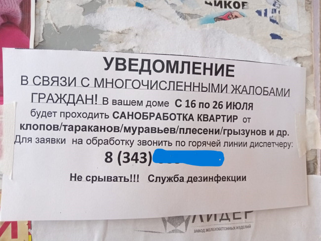 Авторы данного объявления стараются создать видимость того, что обработка квартир явилась следствием массовых обращений жителей с жалобами на появление в их квартирах насекомых. Четко прописывают сроки, в которые будет обрабатываться каждый конкретный дом. А еще требуют данные агитки не срывать. Стиль, который используется в объявлениях, да и сам дизайн объявлений наводят ряд жителей на мысль о том, что инициатива о проведении обработки исходит от управляющей компании. Но это не так.