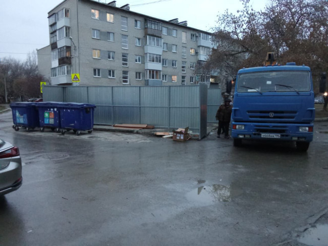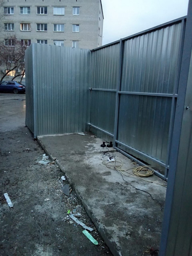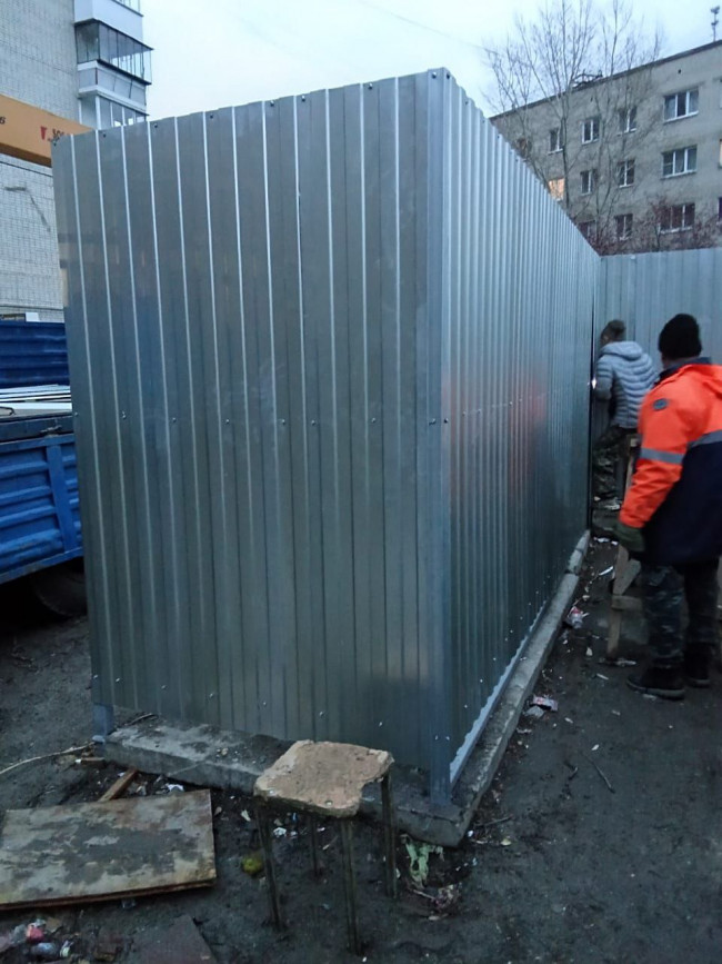 Площадка получила новую одежду из профлиста. Если говорить о форме, это буква «Г». С одной стороны размещаются баки для сбора твердых коммунальных отходов, с другой - крупногабаритного мусора. Данная площадка, что сейчас не характерно, не имеет крыши. Все потому, что под землей проходят инженерные коммуникации. Если произойдет порыв на сетях, конструкцию без крыши будет проще поднять и убрать в сторону для проведения ремонта. А после вернуть обратно.